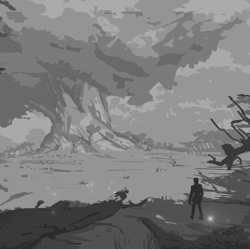 We began sketching the forest with the goal of making it feel alive with large, interesting trees, but distinct from the Ether Tree. Early drafts focused on tree shapes and layout, exploring how to give the land character without turning it into another sacred grove. We tested silhouettes, root arches, and canopy layers, yet the scene felt too still.